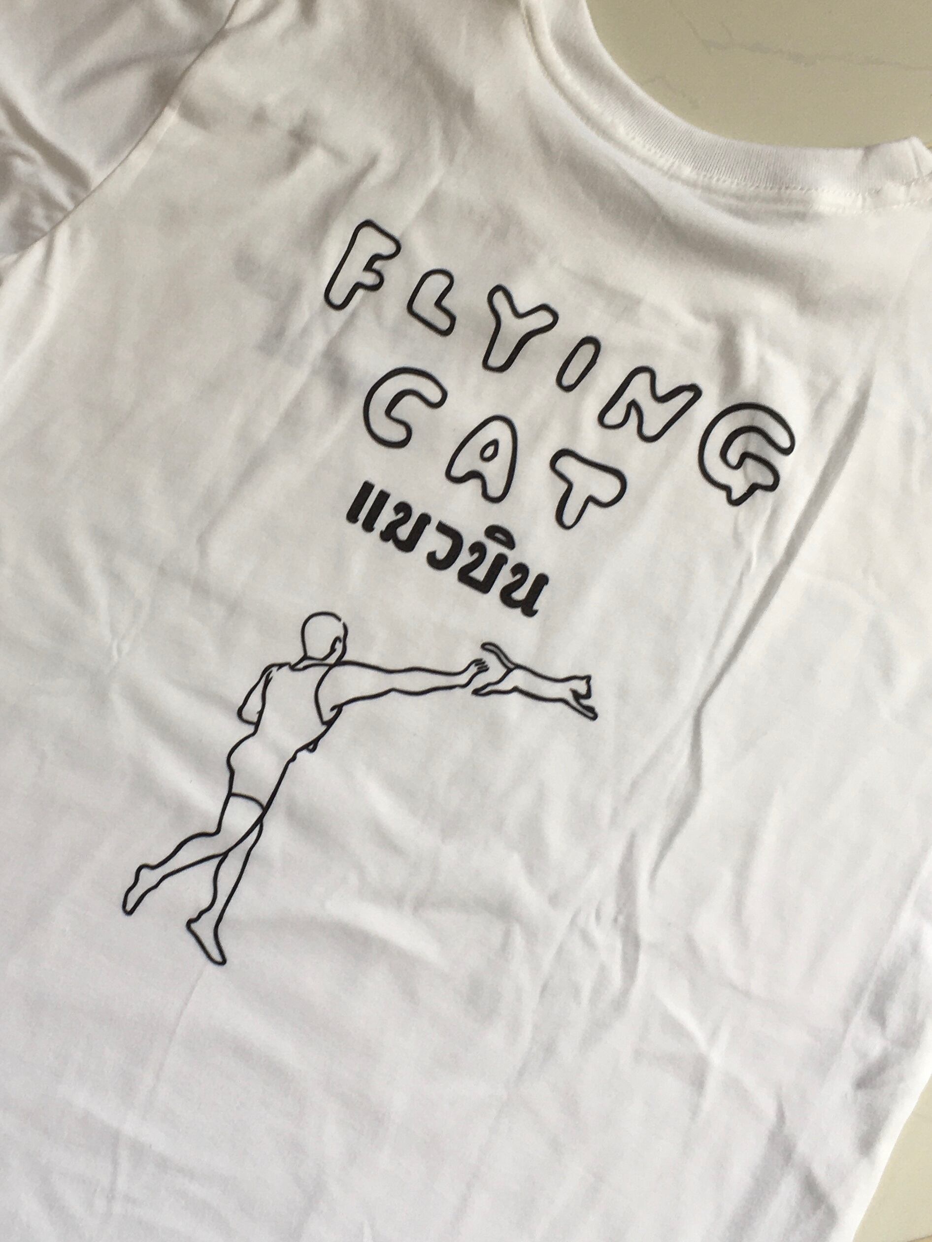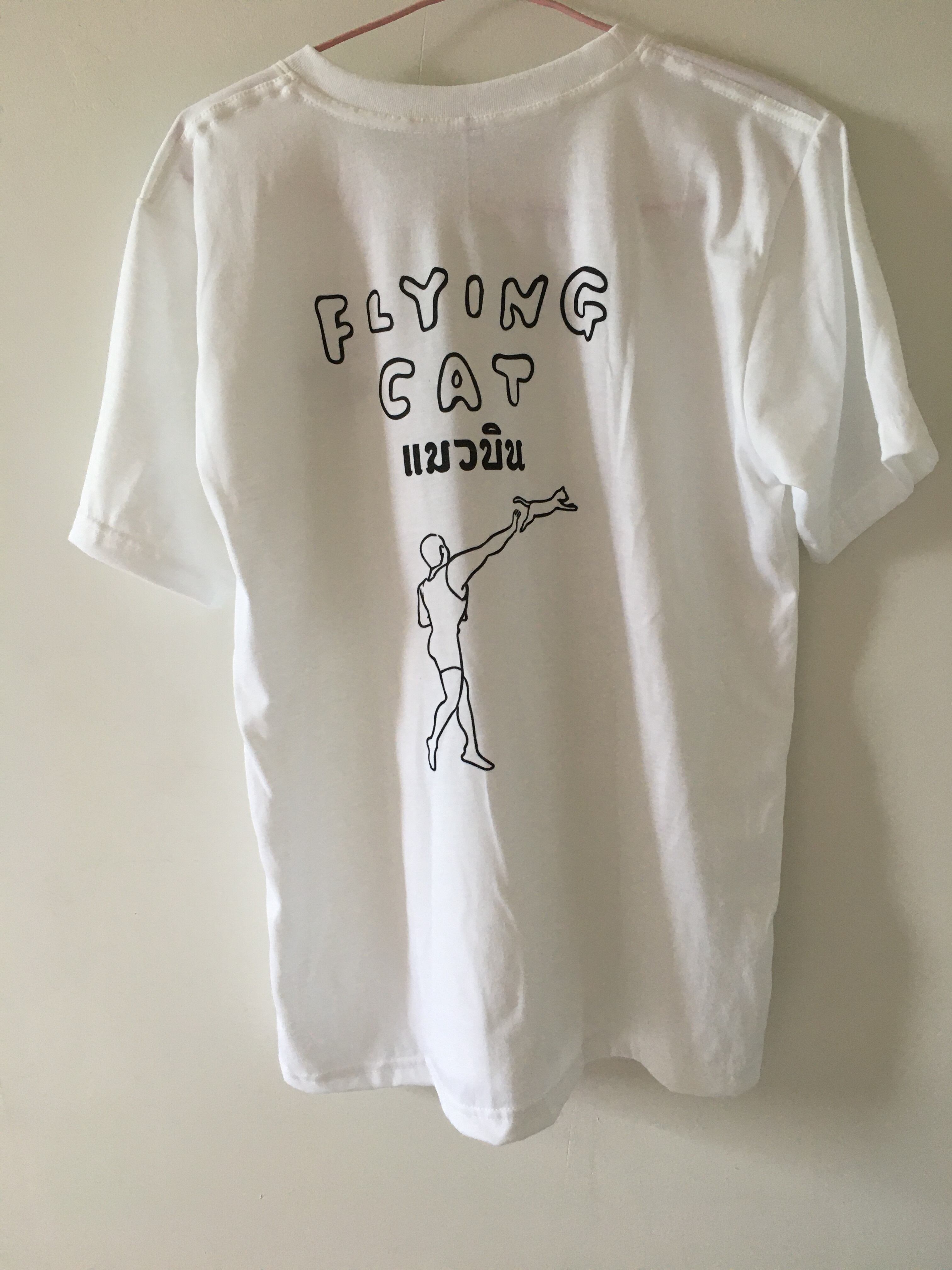 飛んでる猫が可愛いオリジナルデザインTシャツ。タイ語のロゴは飛ぶネコと言う意味です。