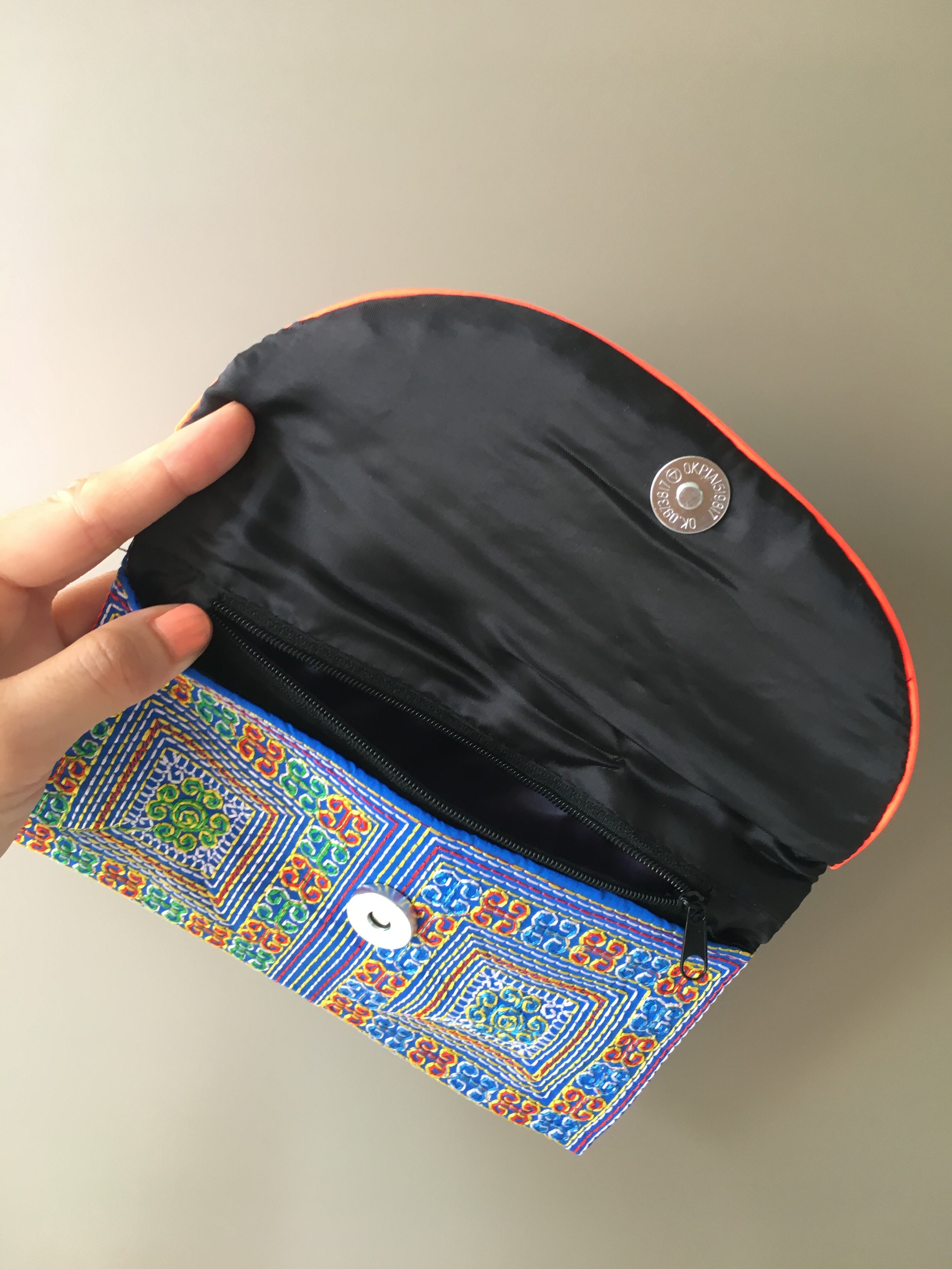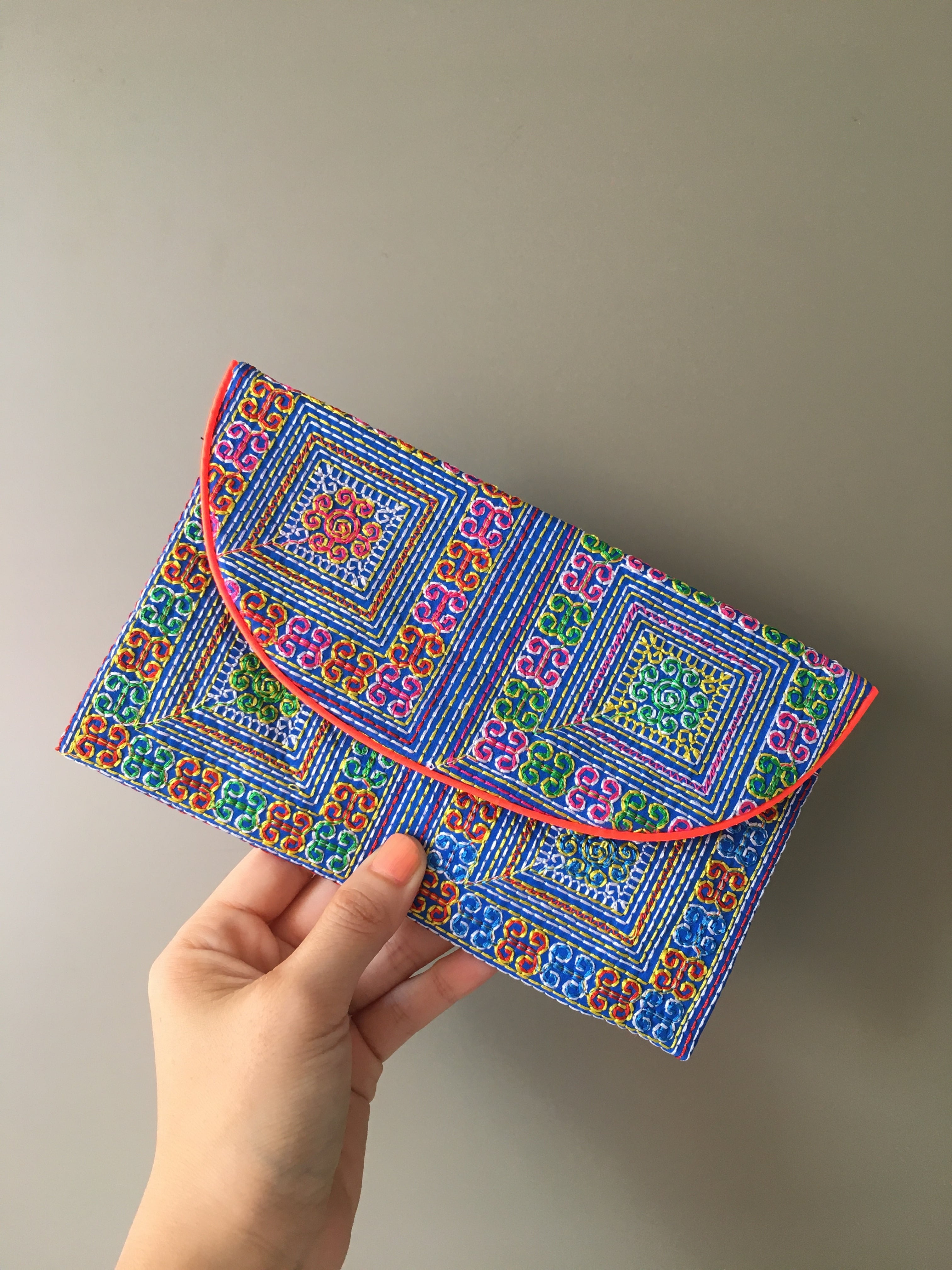 ひとつひとつ手作りの、可愛いモン族刺繍ポーチ。横18cm×縦12cm。